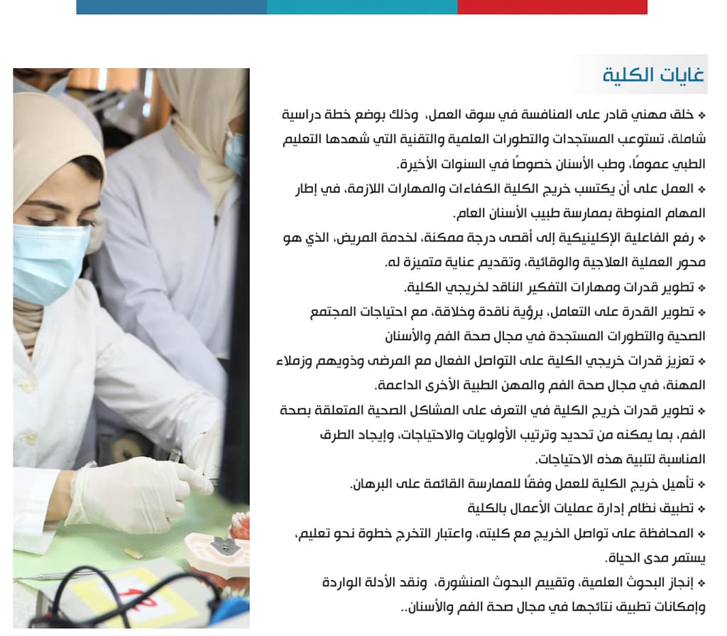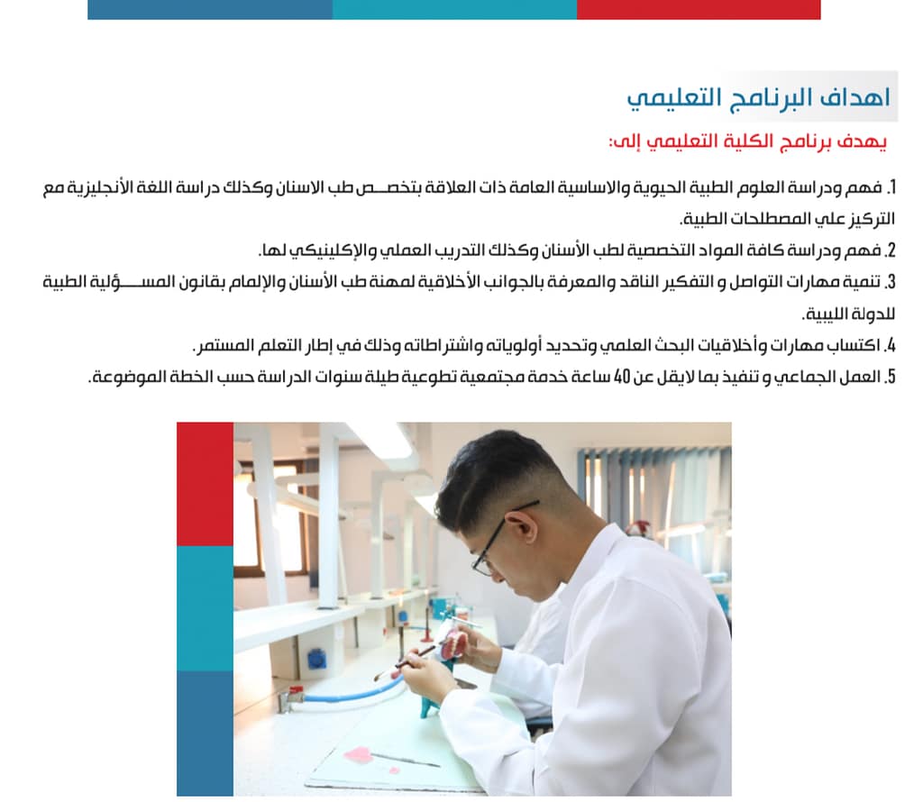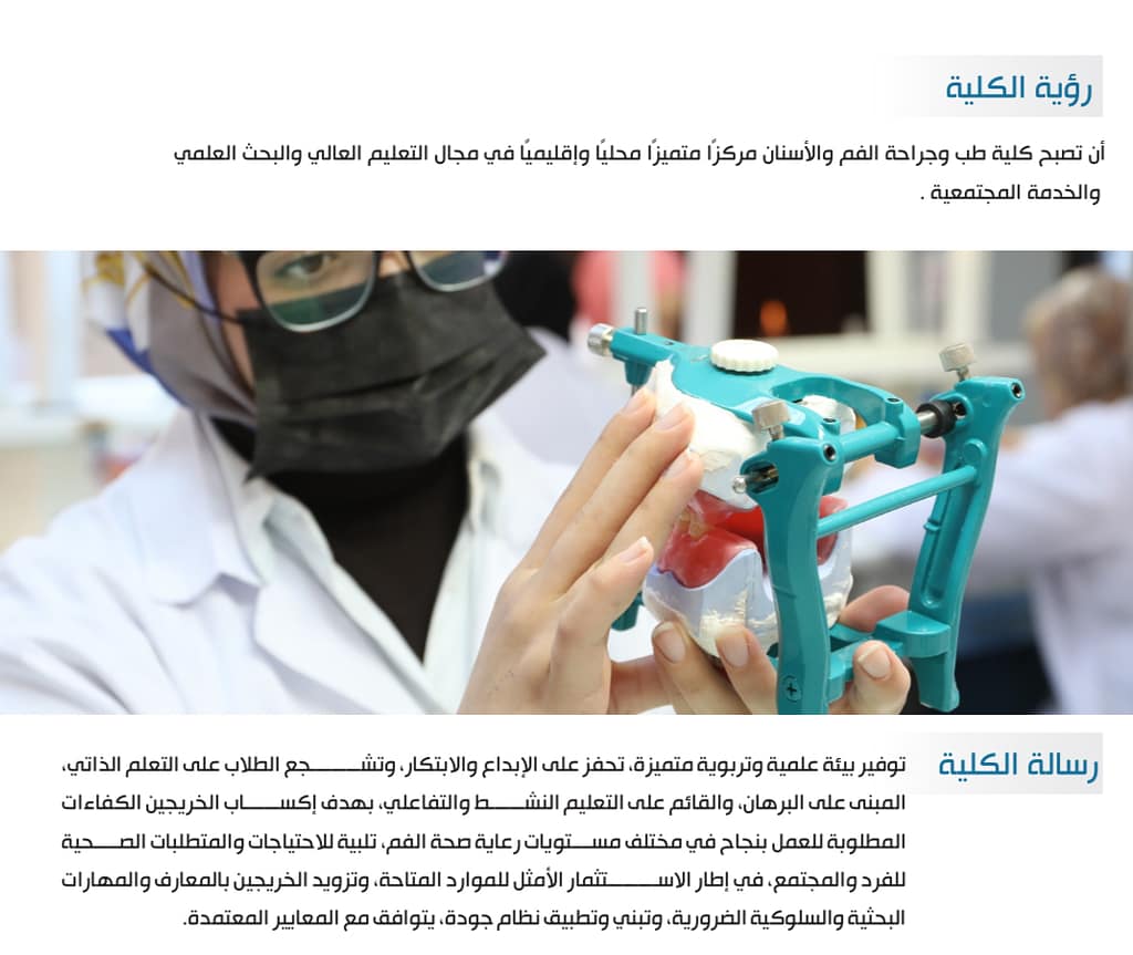 The Faculty of Medicine and Oral and Dental Surgery at the university represents a distinguished qualitative addition to medical education in Libya. It also seeks to be an effective tool for the development of medical services in the field of oral and dental health, and contributes to raising the level of professional performance in a way that ensures the preparation of skilled dentists who are familiar with the requirements of the profession, its ethics and the principles of its practices. Clinical training in accordance with local and international accreditation standards.