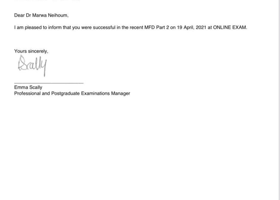 Dr. Marwa Al-Nayhom Passes the Second Part Exam at the Royal College of Surgeons of Ireland